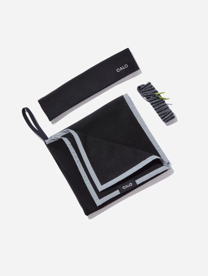 QALO’s Active Accessories Bundle includes one Sport Headband, one Quick-Dry Towel, and one set of our No-Tie Laces all in a black cloth carrying case.