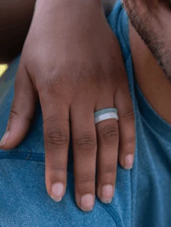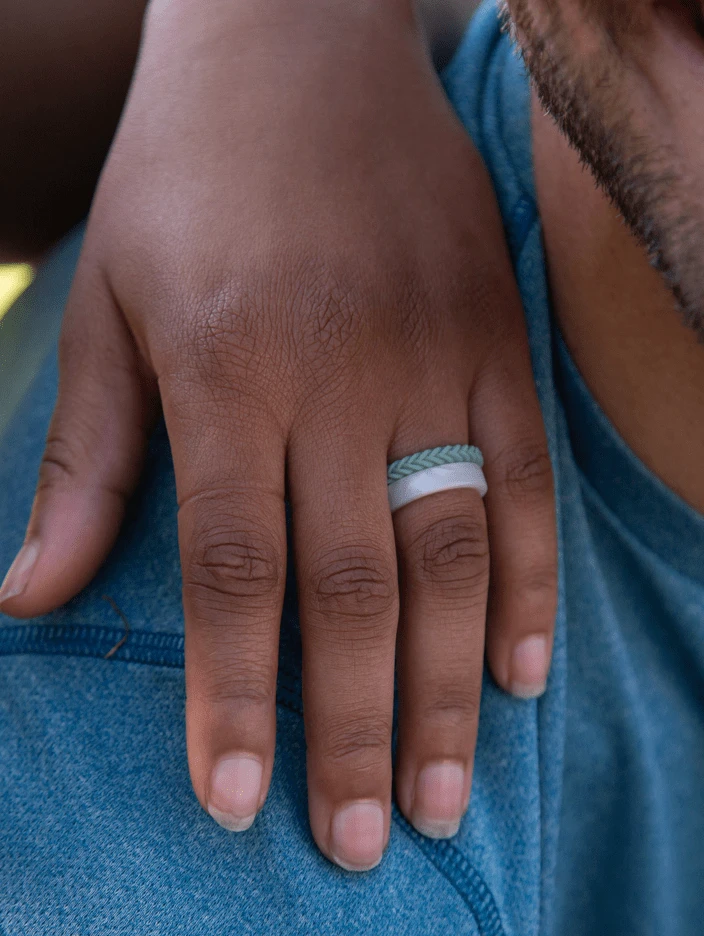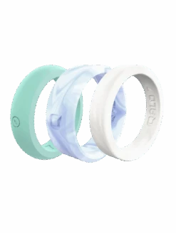 This silicone ring gift set includes a Women’s Aqua FoxFire Classic Outdoors, Pastel Agate Modern, Pearl Smooth Stackable Silicone Rings