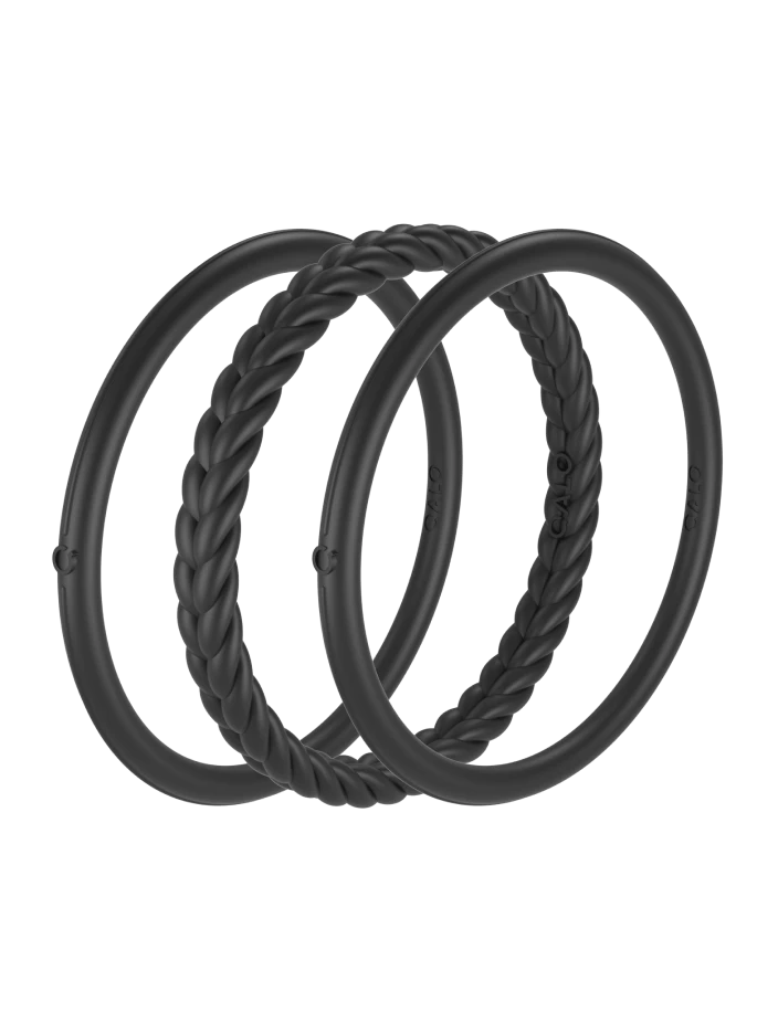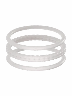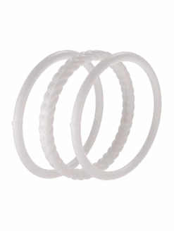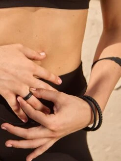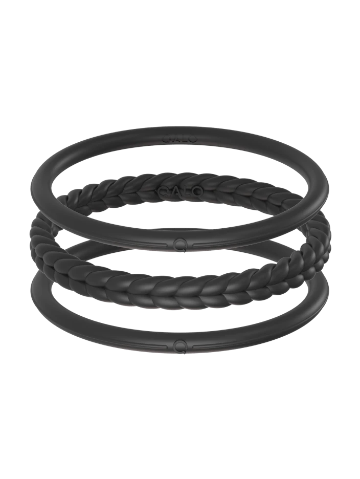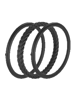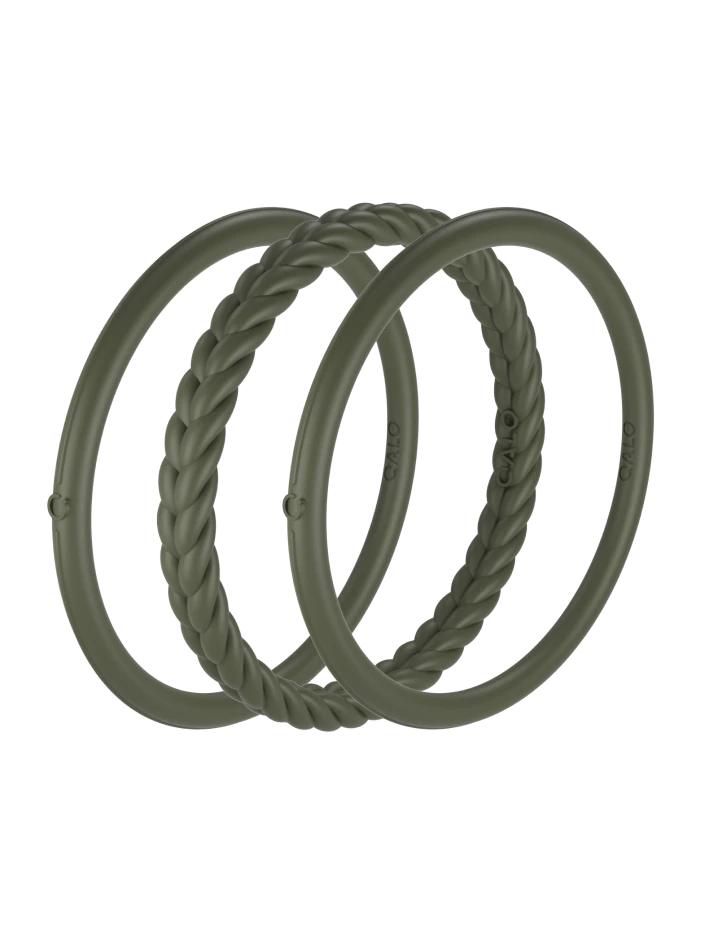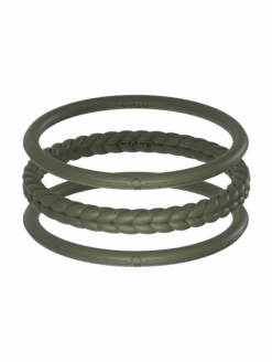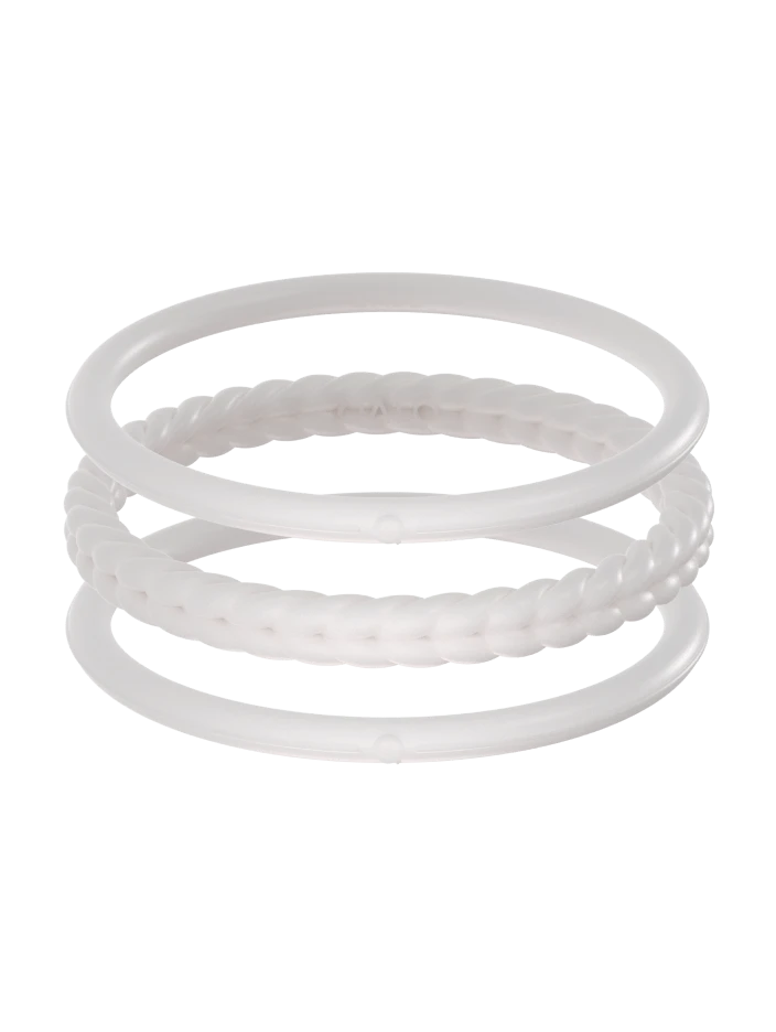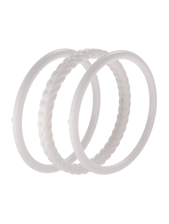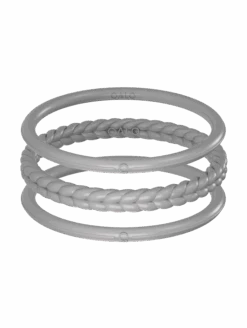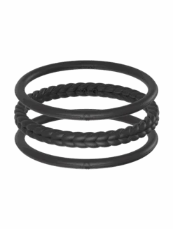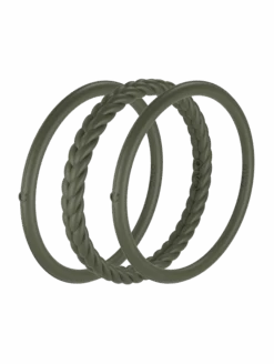 Part of our Core Functional Jewelry collection, the Essential Bangles are crafted from tough, yet ultra-comfortable silicone, and are made to be worn through all kinds of movement. This set of three includes one braided silhouette, and two smooth silhouettes. Available in Pearl, Silver, Black, and Sage.