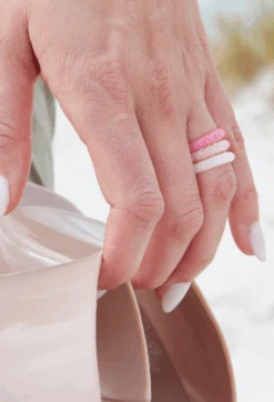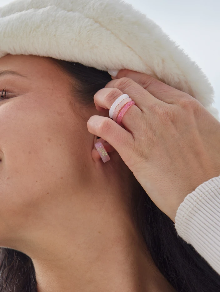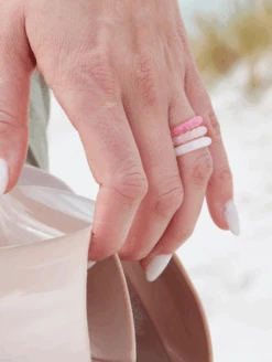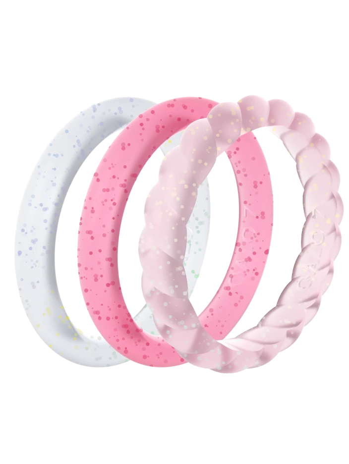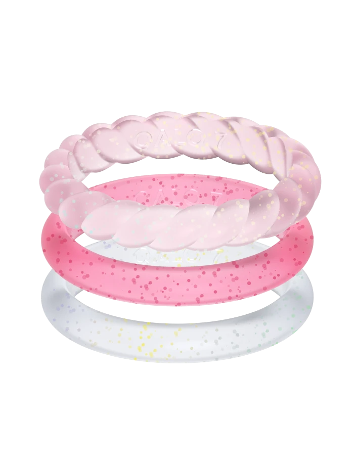 This triple stack includes two smooth silhouettes and one twist silhouette in translucent shades of sparkling pink and white.