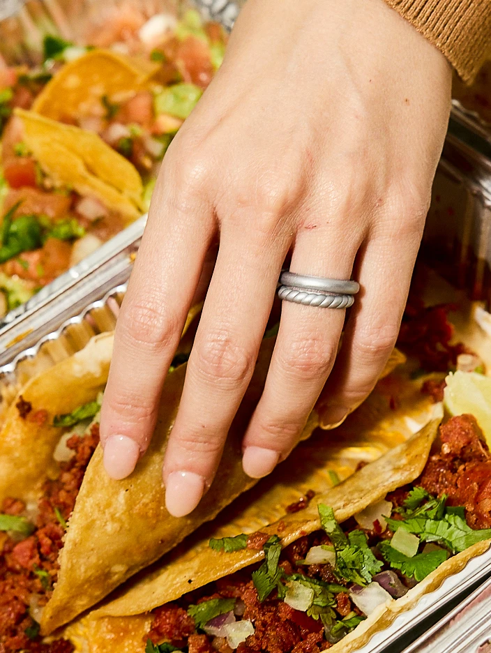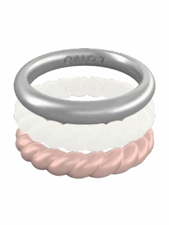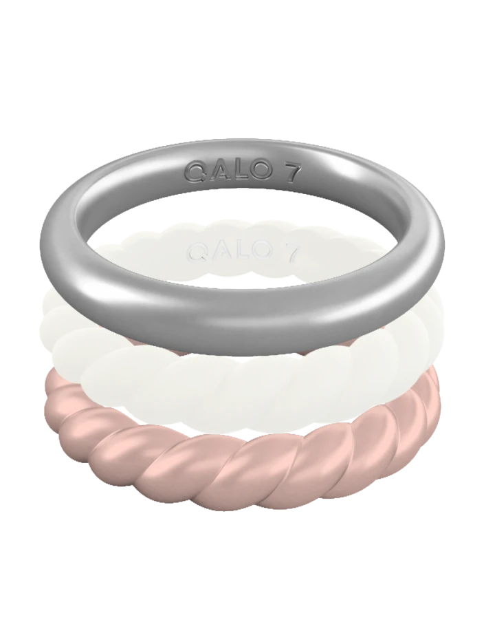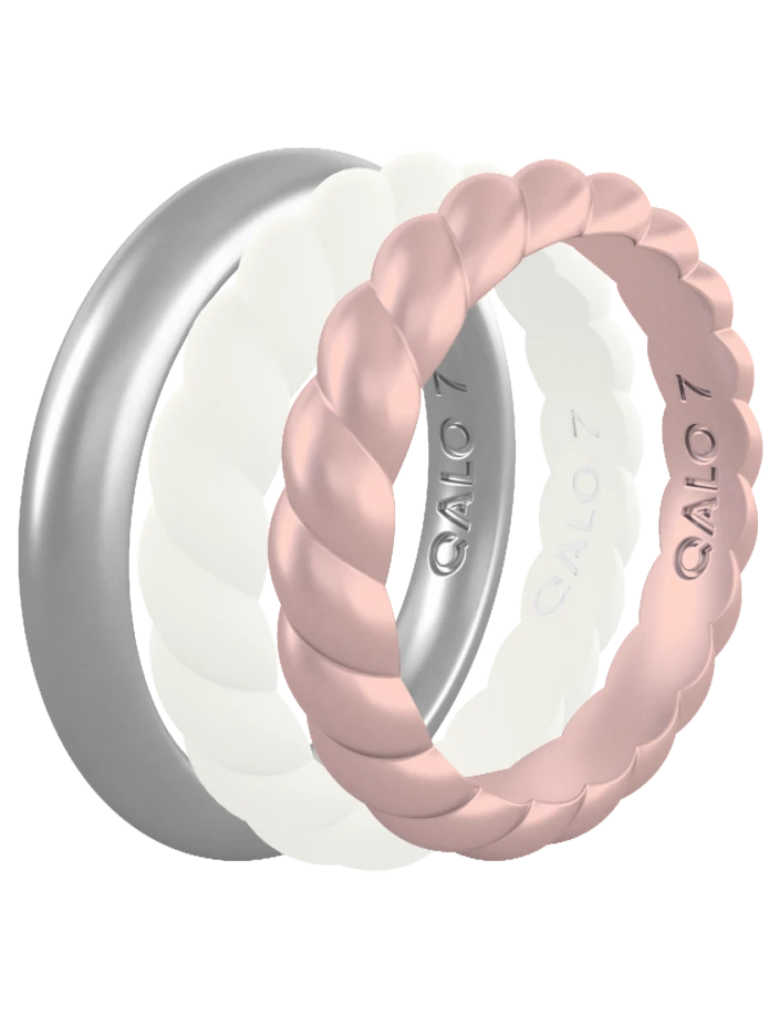 This stackable set includes the Rose Gold Metallic Twist Stackable, White Twist Stackable, and Silver Metallic Classic Stackable.